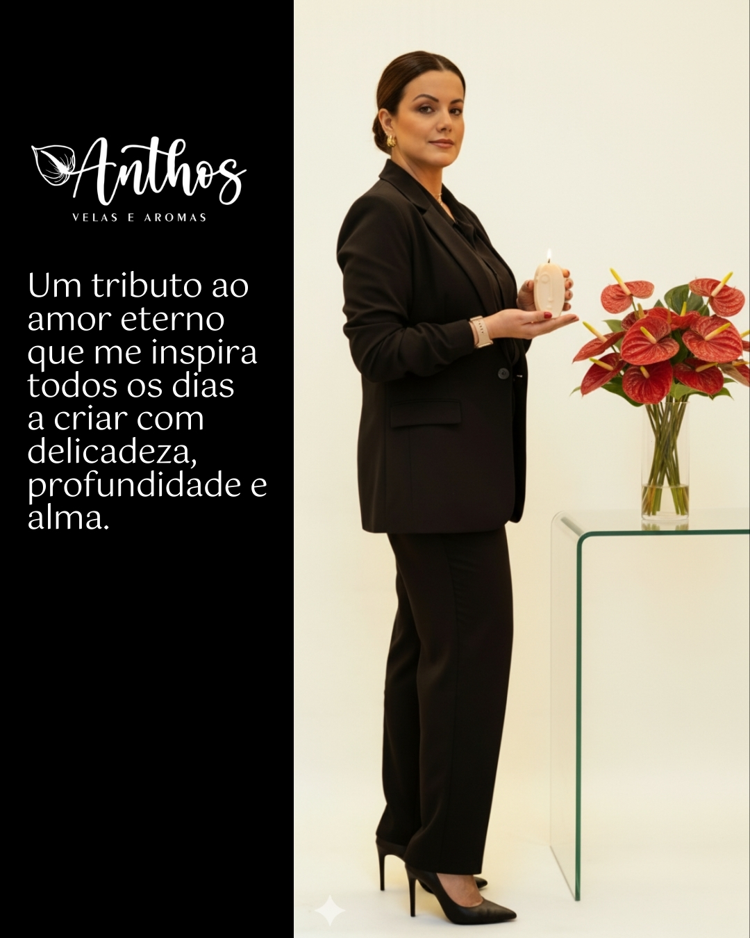 Escolhi o Antúrio como símbolo da nossa marca por sua elegância exótica, mas também por sua forma de coração - um tributo ao amor eterno que me inspira todos os dias a criar com delicadeza profundidade e alma. Cada peça da Anthos - seja uma vela artesanal, um home spray ou um presente aromático - é feita com esse mesmo carinho. Não criamos apenas produtos: traduzimos emoções em fragrâncias, memórias em luz e presença em forma.